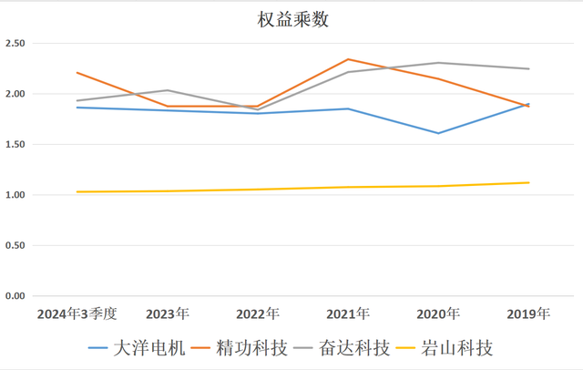 财务杠杆:精功科技>奋达科技>大洋电机>岩山科技