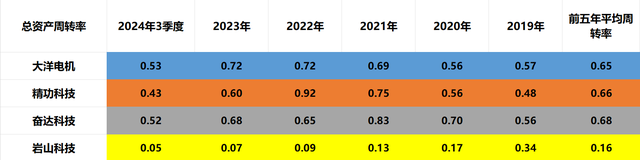 目前周转速度最快的是大洋电机3季度总资产周转0.53次,其次奋达科技,再次精功科技,再次岩山科技。